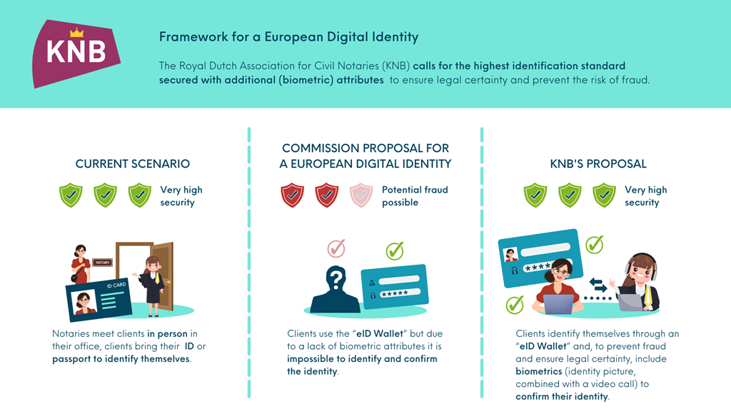 Bij de elektronische handtekening en het elektronisch identificeren van cliënten is met name het niveau van de betrouwbaarheid van belang. De eIDAS-verordening uit 2014 maakt het al mogelijk akten digitaal te ondertekenen, maar in het voorstel tot vernieuwing van deze verordening wil de Europese Commissie lidstaten verplichten aan burgers een Europese digitale identiteit te verschaffen, de zogenaamde European Digital Wallet.